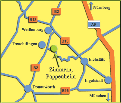 Von der B2 kommend passieren Sie auf der St2230 zunächst Pappenheim und fahren dort weiter Richtung Eichstätt. Bereits nach ca. 2 km treffen Sie in Zimmern ein. Fahren Sie nun auf der Hauptstrasse weiter durch den Ort bis ca. 200 m vor den Ortsausgang. Dort fahren Sie recht von der Hauptstrasse ab. Schon 50 m weiter dürfen wir Sie bei uns begrüßen.