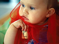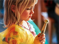 Einfache Instrumente wie Klanghölzer, Glöckchen, Rasseln oder Trommeln führen das Kind in die Welt der Klänge.
