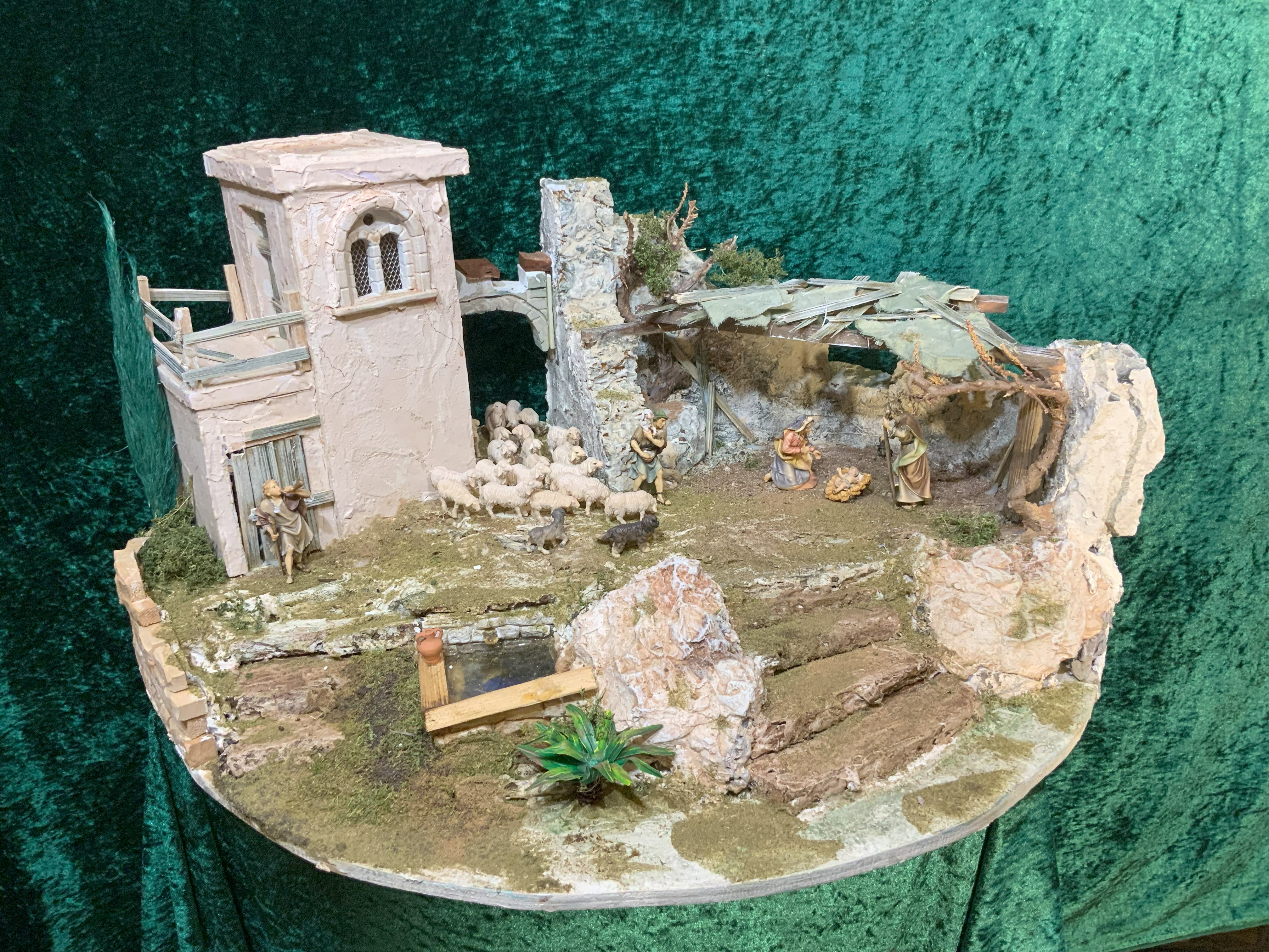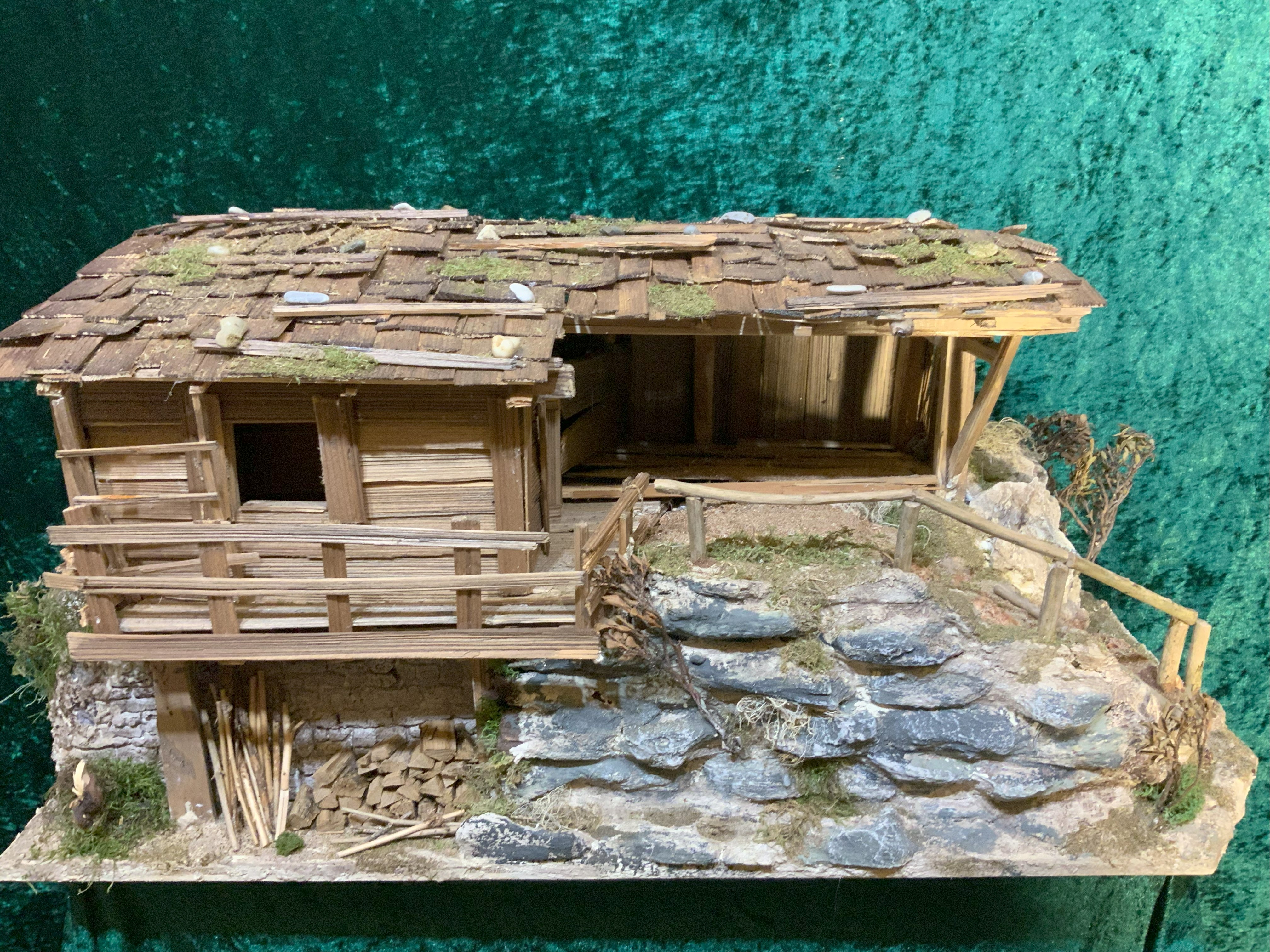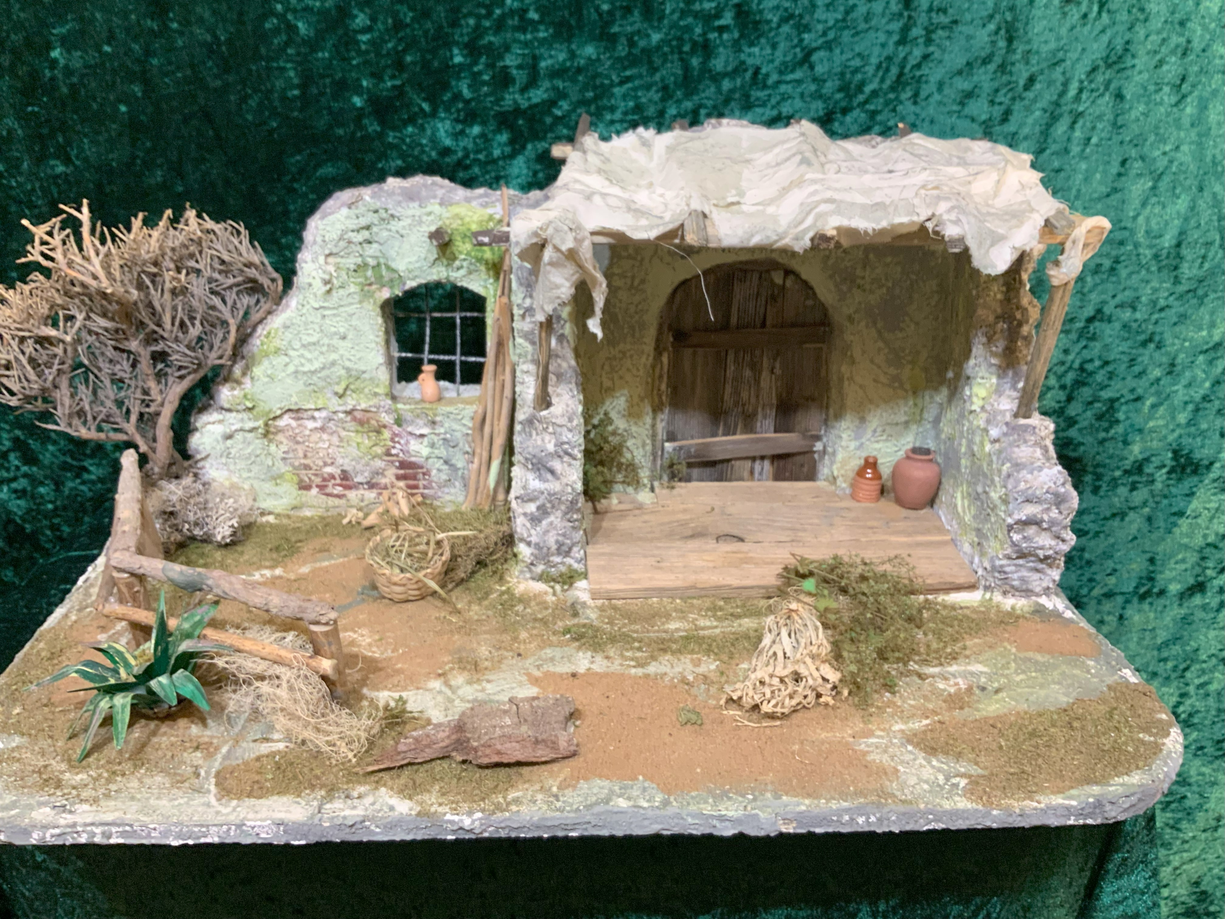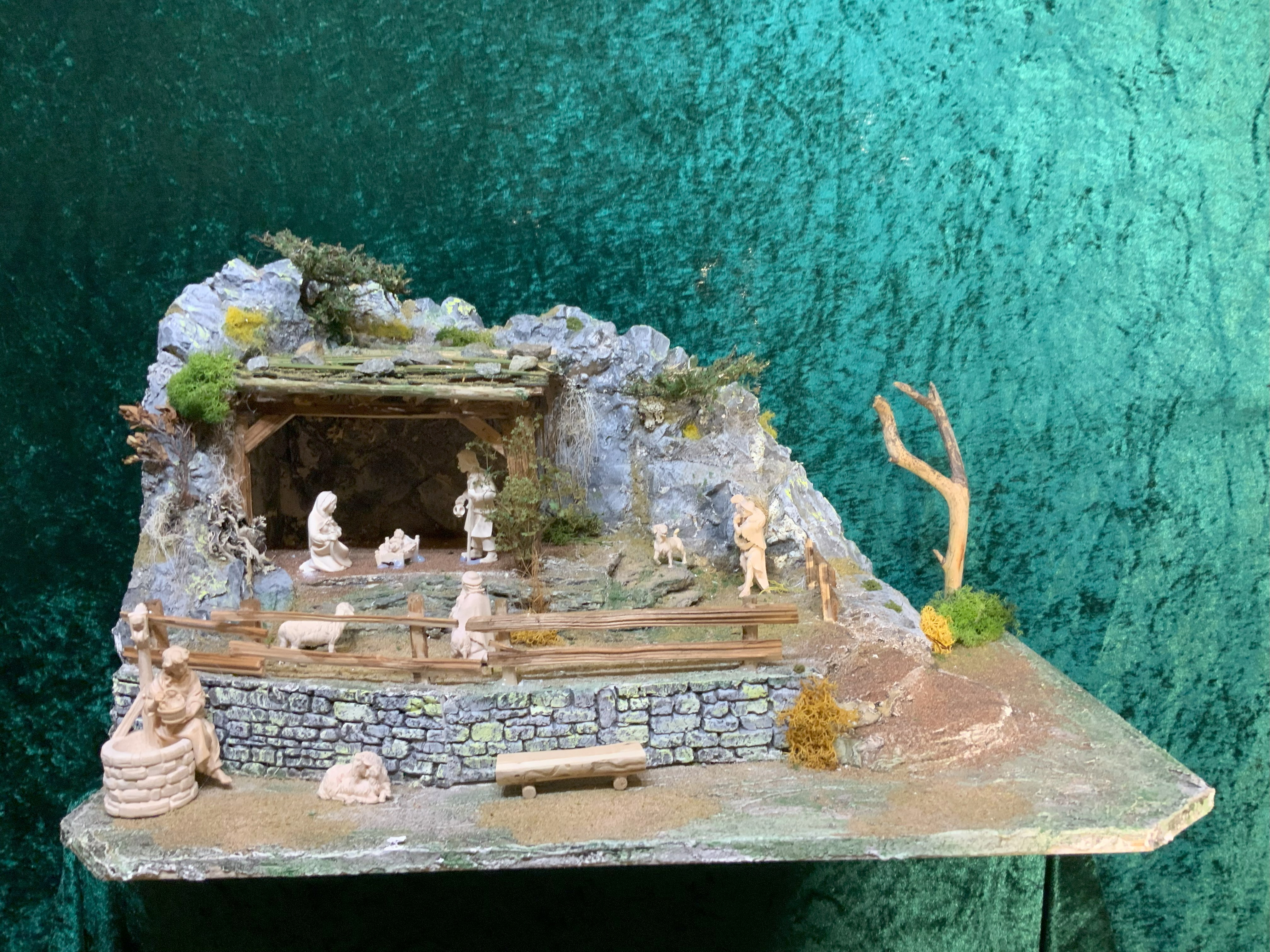 Alte Weinkisten liebevoll gestaltet, beleuchtet und vielen Accessoiren. Figuren Grundkörper holzgeschnitzt "Heide" mit Stoff kaschiert.
